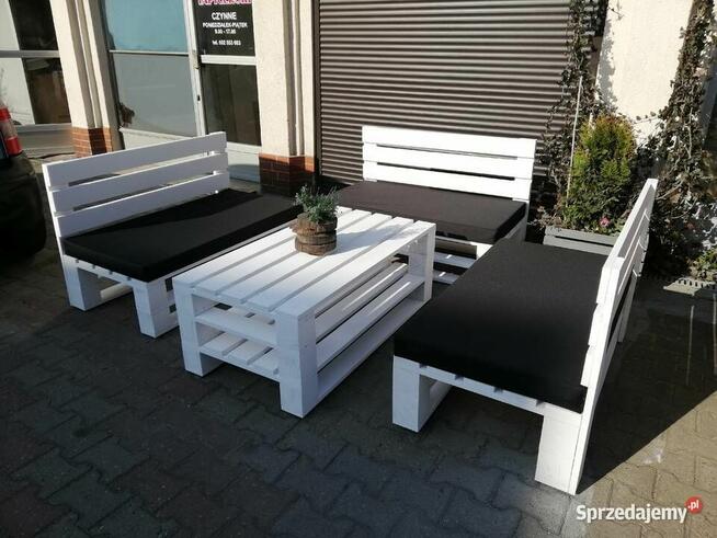 Drewniany zestaw mebli ogrodowych wykonany na wzór palet w kolorze białym składający się z 3 kanap, ławy oraz 3 ...