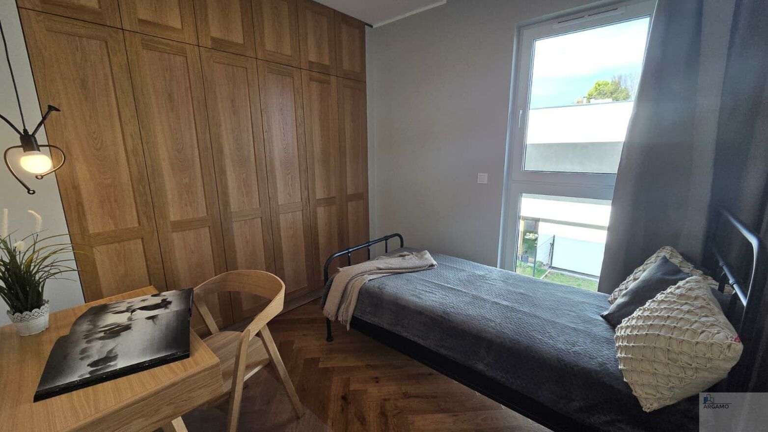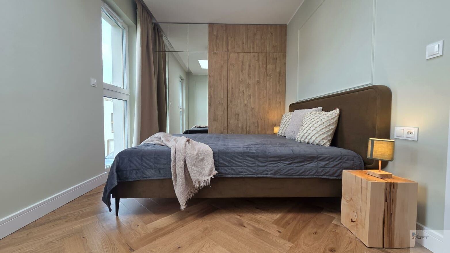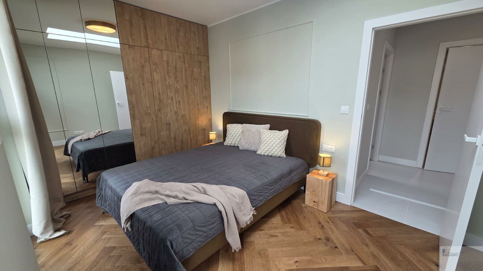 - główna sypialnia z podwójnym łóżkiem i zabudowaną szafą