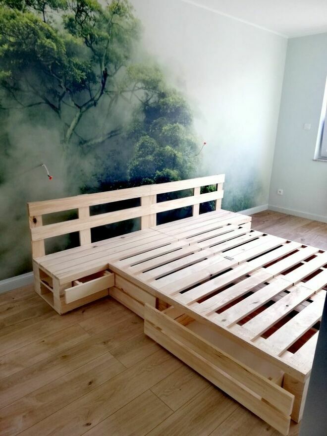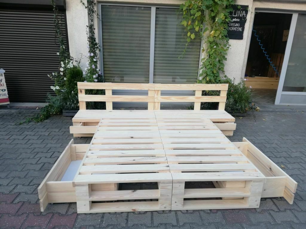 Łóżko z drewna świerkowego na wzór palet pod materac 160x200 z zagłówkiem dwoma stolikami nocnymi z małymi szufladami oraz dwoma dużymi szufladami na pościel