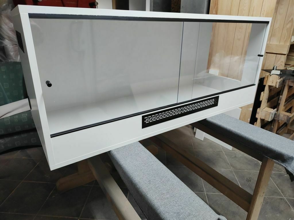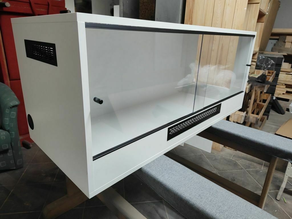 Terrarium z płyty meblowej o wymiarach 120x50x50 cmPosiada wentylację (do wyboru przód i góra, przód i bok prawy/ lewy) ,na froncie szybki przesuwne z pleksi o grubości 4 mm,